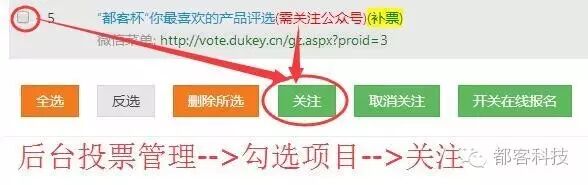 第一步:登录vote.dukey.cn 进入后台管理=>项目管理=>勾选=>设置关注